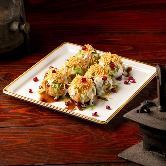 يأتيكم هذا الطبق من شوارع بومباي القديمة، ٦ كرات من البوري المقرمشة والمحشوة بالبطاطا والبصل، تعلوها صلصات مختلفة من الزبادي والنعناع والتمر الهندي الحلو، ومزينة بالرمان و الكزبرة الطازجة