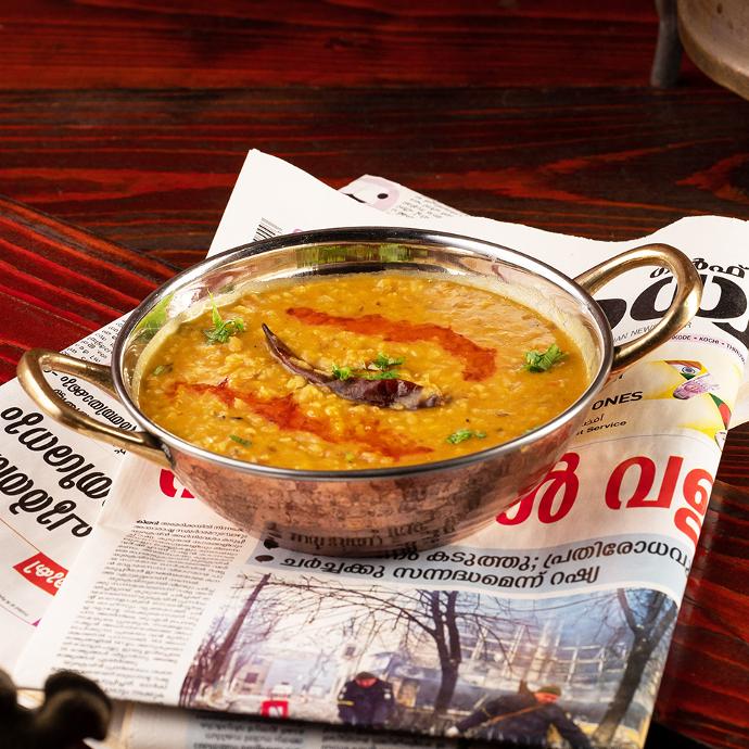 عدس أصفر مطهو مع البصل في مرق الطماطم بنكهة الكمون والكزبرة الطازجة. يقدم مع خبز النان السادة