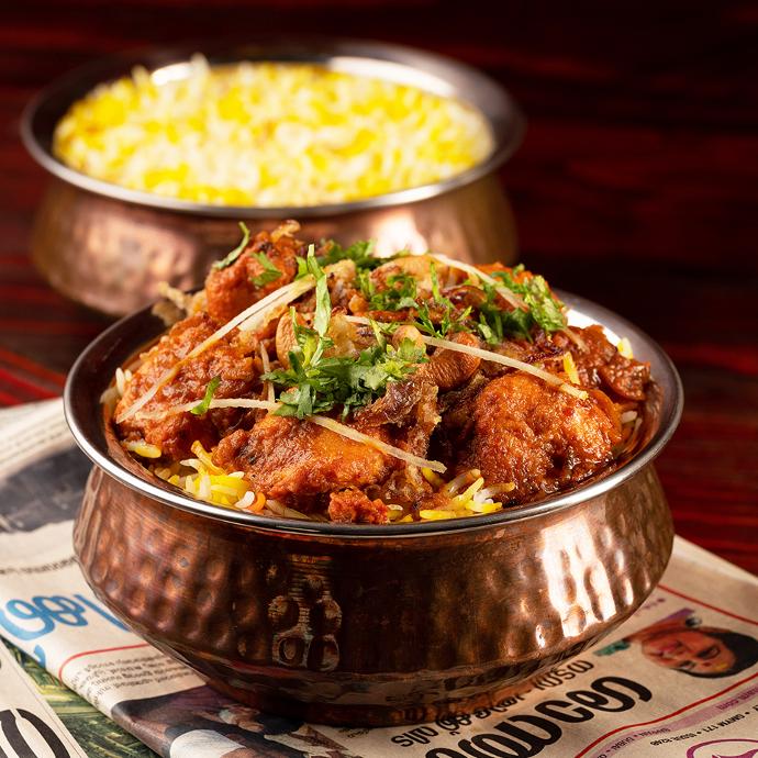 أرز البسمتي الهندي مع مكعبات سمك الفيليه الأبيض مشوي في التندور ومتبل ببهارات الماسالا الهندية، مزين بالكاجو والبصل المكرمل. يقدم مع سلطة الزبادي.
