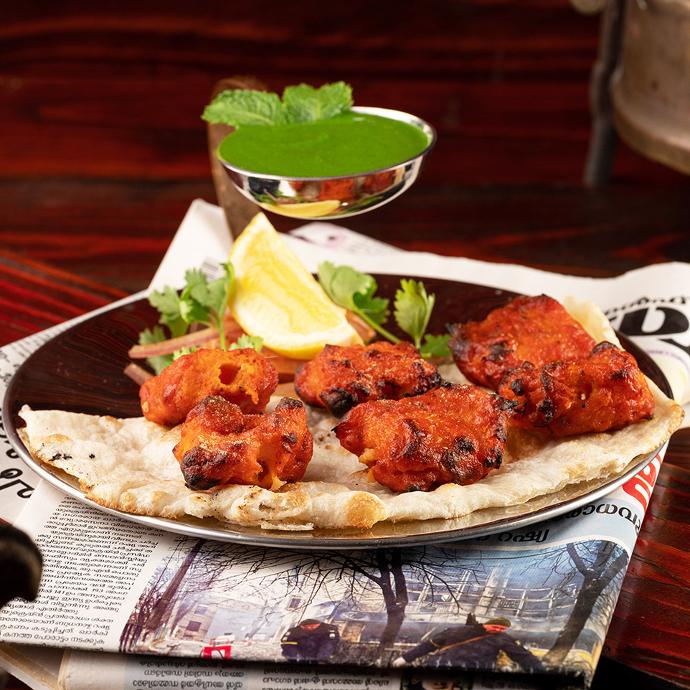 Prepared from boneless white fish fillet cubes grilled in the tandoor in the traditional way,and marinated with yogurt, Indian spices, ginger, and lemon. Served with onion spiced salad, lemon slices, mint chutney, and plain naan bread.