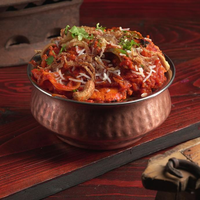أرز البسمتي الهندي مع جبنة البانير (قريش) مطبوخة في مرق الماسالا الهندي ومزين بالكاجو والبصل المكرمل. يقدم مع سلطة الزبادي.