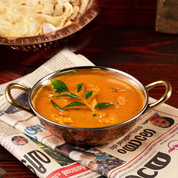 Prawns marinated with saffron, tomatoes, cooked in coconut cream sauce, dry curry leaves and cashew paste, Served with plain naan bread