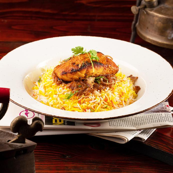 أرز البسمتي الهندي يعلوه سمك السالمون مالتبل في بهار الماسالا الهندي، و مُنكهة بالفلفل الأسود، وعصير الليمون، مزين بالكاجو والبصل المكرمل. يقدم مع سلطة الزبادي.