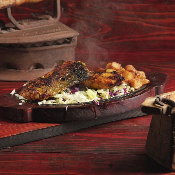 طبق صحي خاص من السلمون المتبل في بهارات الماسالا والليمون والزعفران وماء الورد مشوح بالزبدة على النار. يقدم على طبق السيزلرز الساخن مع الخضروات الطازجة المسلوقة. يقدم مع سلطة البصل المتبل وسلطة الزبادي وخبز أسمر من التنور.
