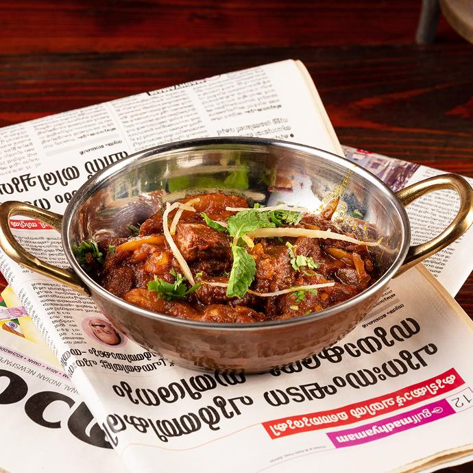 مكعبات فاخرة من لحم الضأن الهندي منزوع العظم، والمطبوخ جيداً في صلصة الماسالا بالزبدة والبصل والطماطم، منكه بالكزبرة الطازجة. يقدم مع خبز النان السادة